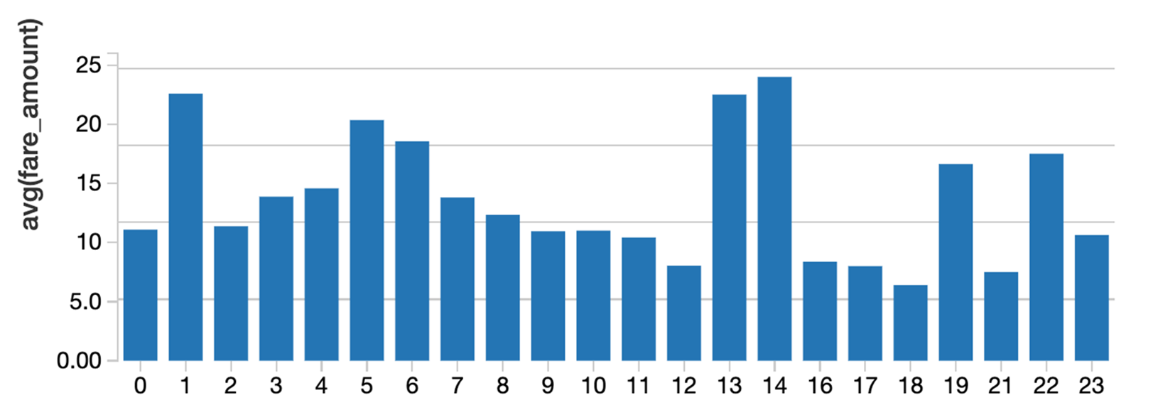 现在,我们可以使用 Spark SQL 并提出一些问题来探索可能影响出租车费用的因素,例如:“一天中每小时的平均车费是多少?”