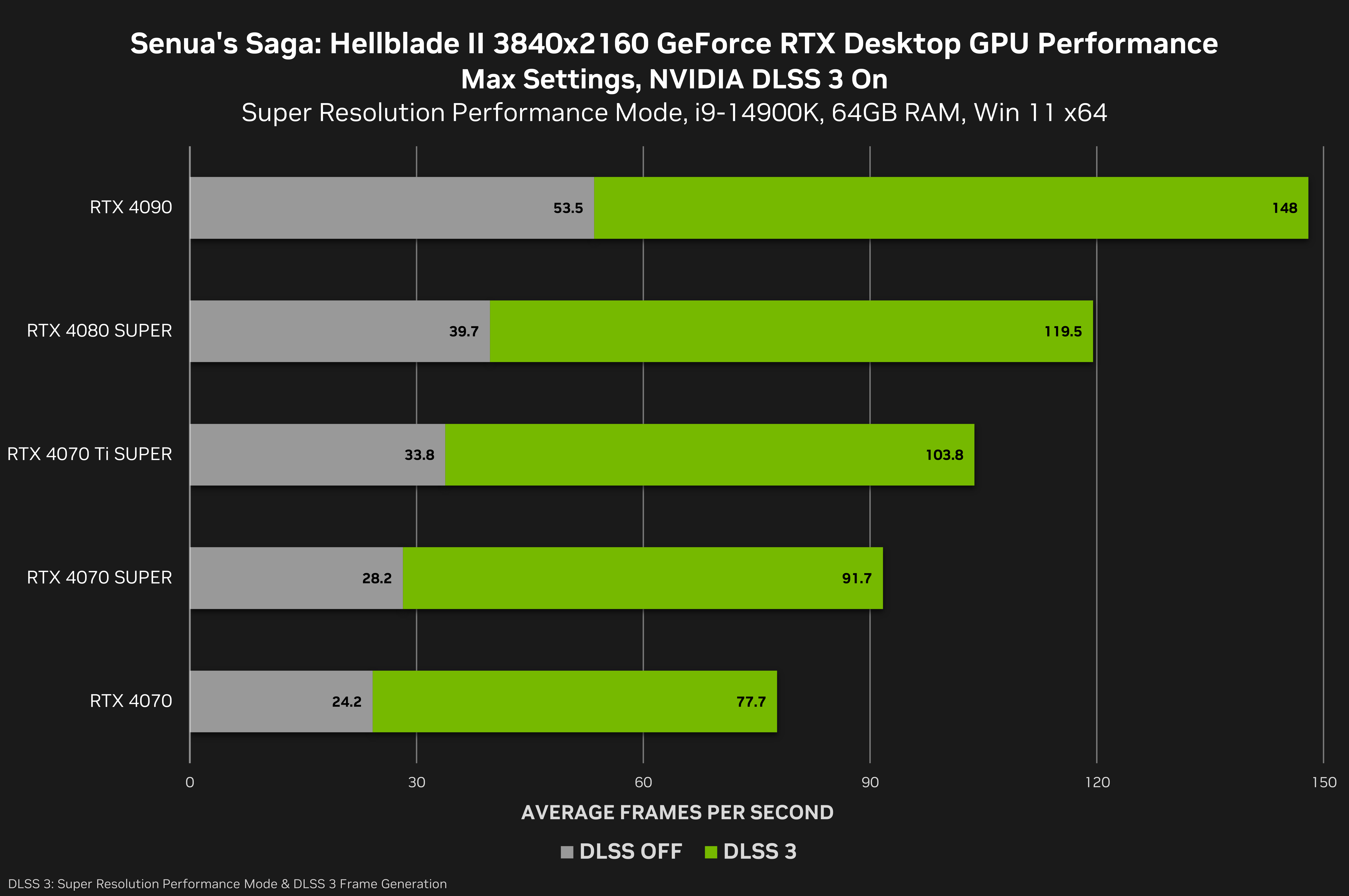 启用 DLSS 3 后,在 4K 分辨率下并开启“地狱之刃 2:塞娜的传说 (Senua's Saga: Hellblade II)”的游戏最高设置时,帧生成可将性能平均提升至原来的 3 倍。GeForce RTX 4070 玩家可以舒适地畅享超过 60 FPS 的游戏体验,并且如果玩家使用速度更快的 GeForce RTX 40 系列显卡,帧率会变得更快,在 GeForce RTX 4080 SUPER 上最高可达到近 120 FPS。