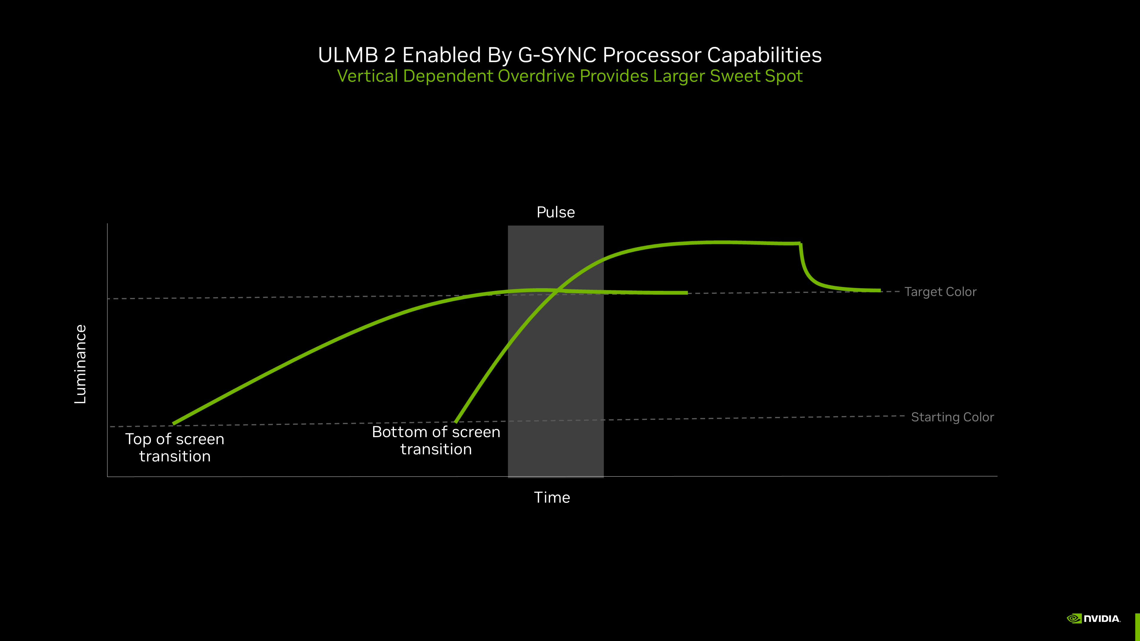 G-SYNC 的 ULMB 2 技术解决了这个问题,因此与其他背光频闪技术相比,具有显著的优势:借助 G-SYNC,我们能够根据垂直扫描位置来控制响应时间,从而使整个面板的像素在正确的时间具有正确的亮度,从而实现精准的开启背光。我们称之为“Vertical Dependent Overdrive”。