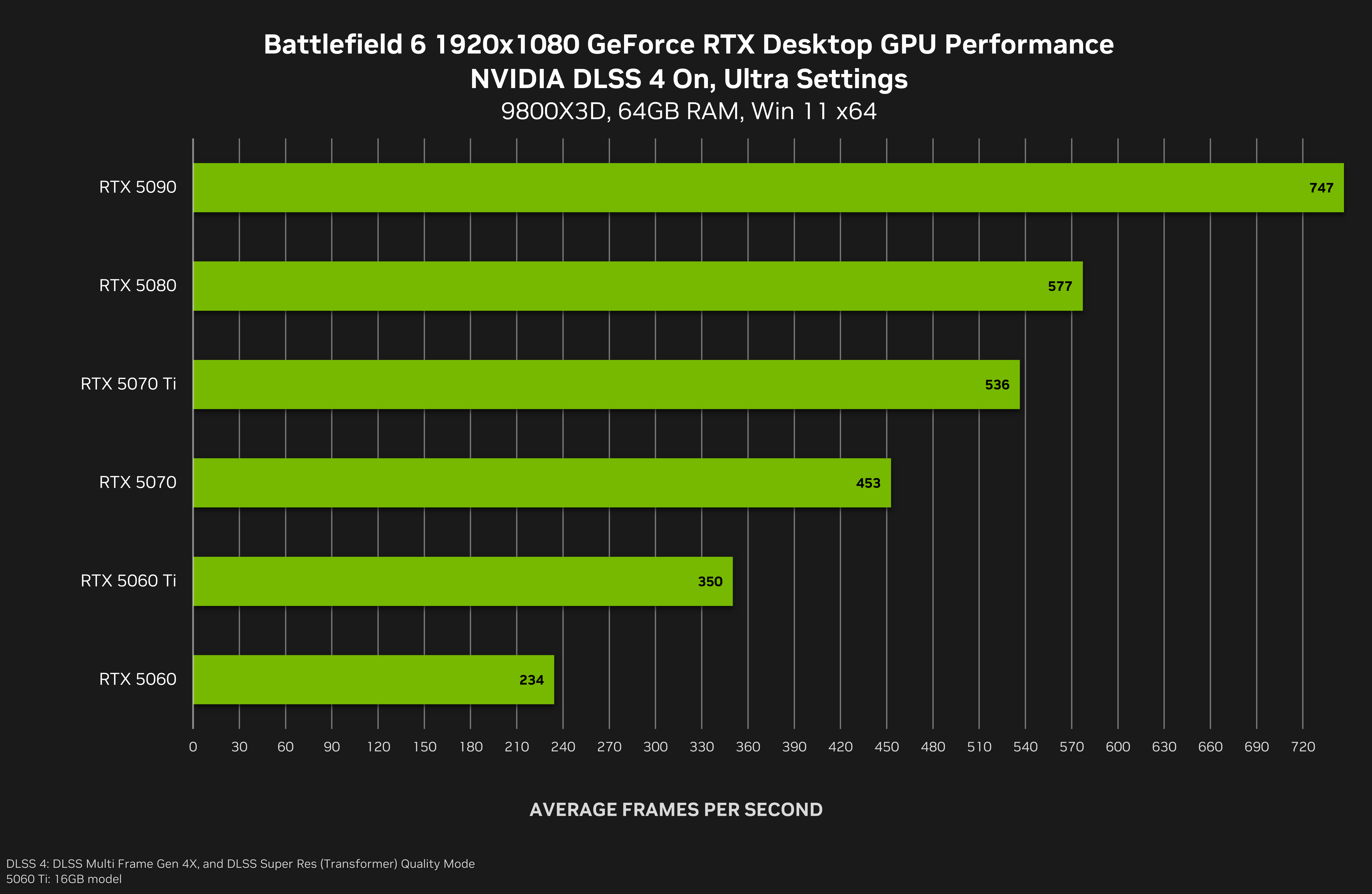 在 1920x1080 分辨率和极致设置下,开启 DLSS 4 多帧生成和 DLSS 超分辨率,“战地风云 6 (Battlefield 6)”在 GeForce RTX 50 系列运行的帧率可平均提升至原来的 2.9 倍,使 GeForce RTX 5060 及以上显卡都能以超过 230 FPS 的帧率畅玩游戏。