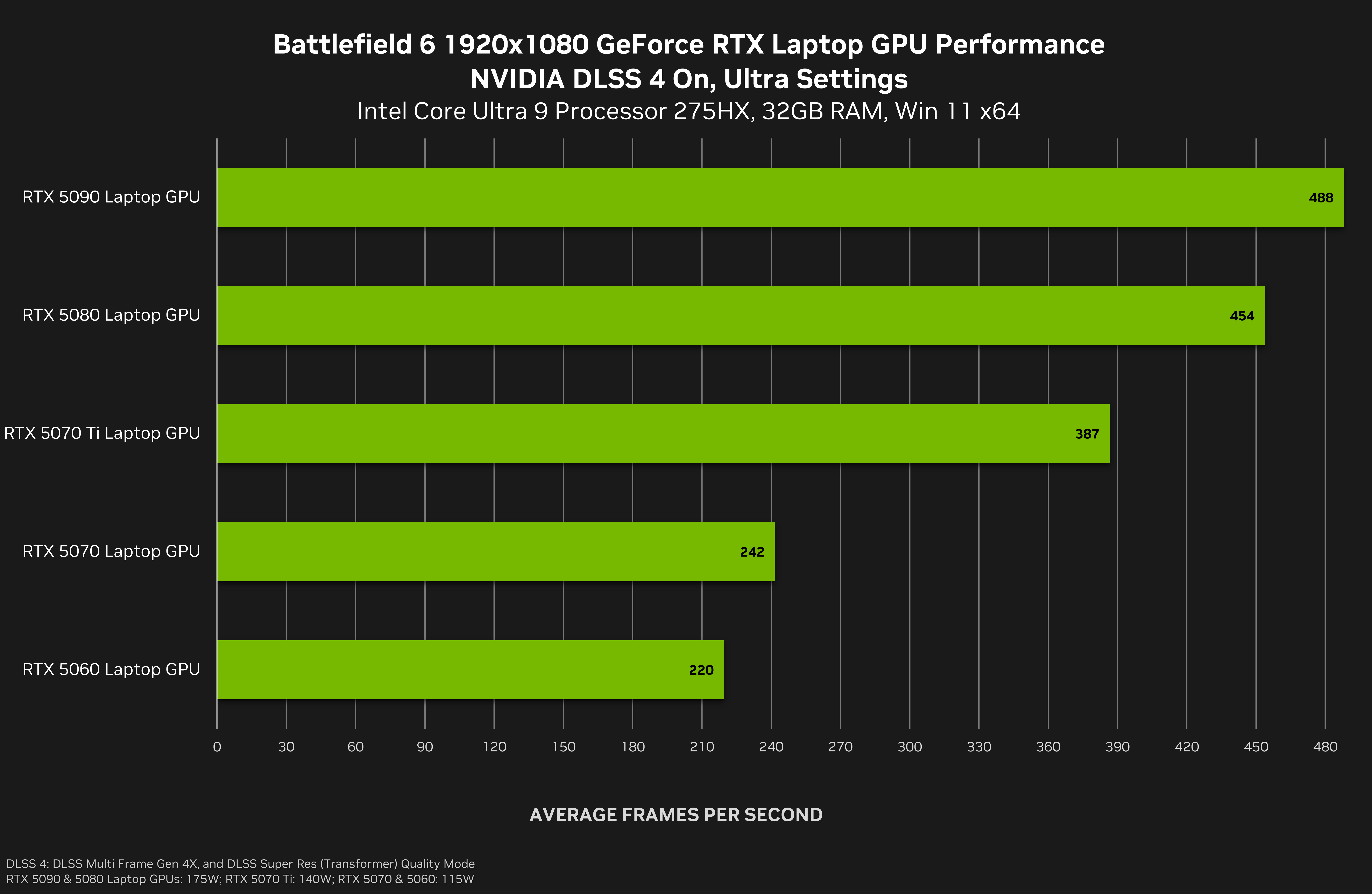 在 1920x1080 分辨率和极致设置下,GeForce RTX 50 系列笔记本电脑 GPU 的性能可平均提升至原来的 2.8 倍,使 GeForce RTX 5090 笔记本电脑运行“战地风云 6 (Battlefield 6)”的帧率可突破 480 FPS,并使 GeForce RTX 5060 及以上笔记本电脑均可以超过 200 FPS 的帧率运行游戏。