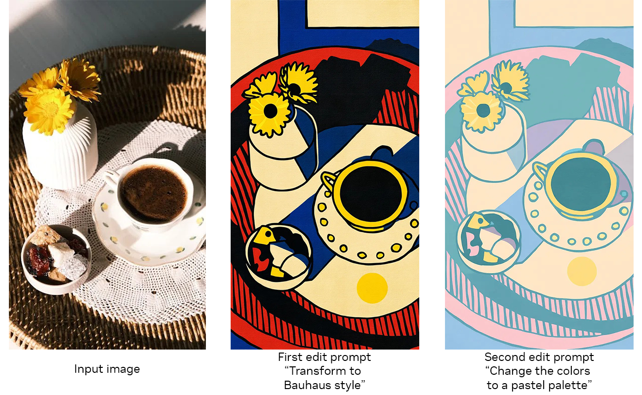 Three side-by-side images of the same graphic of coffee and snacks on a table with flowers, showing an example of multi-turn editing possible with the FLUX.1 Kontext [dev] model. The original image (left); the first edit transforms it into a Bauhaus style image (middle) and the second edit changes the color style of the image with a pastel palette (right).