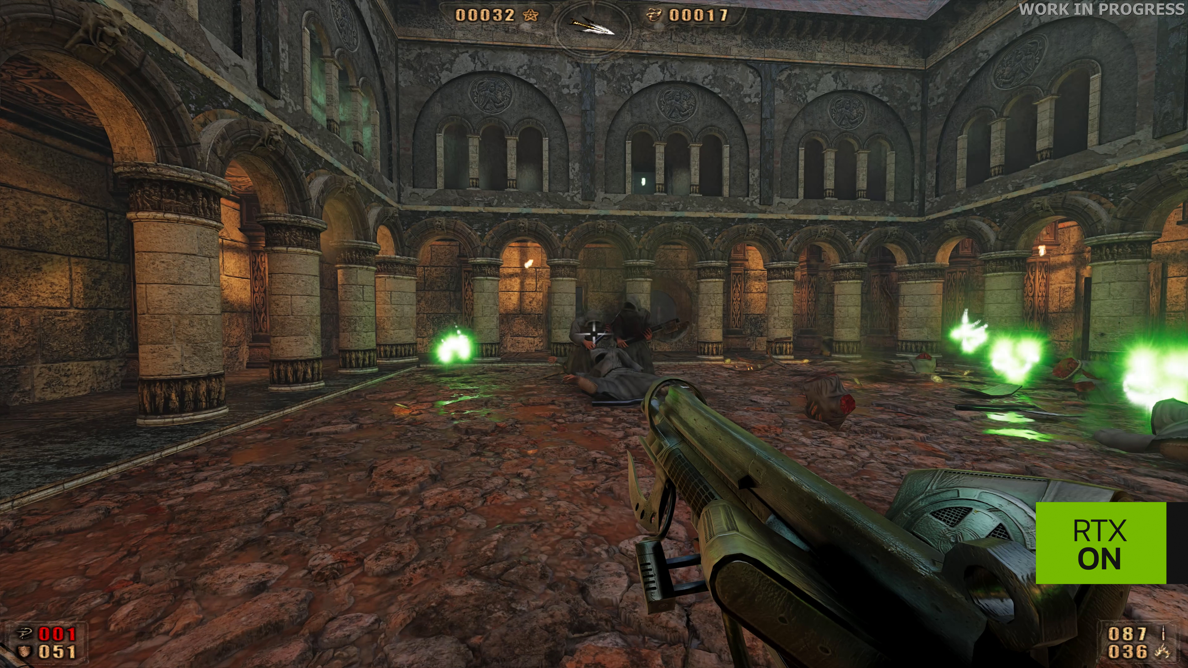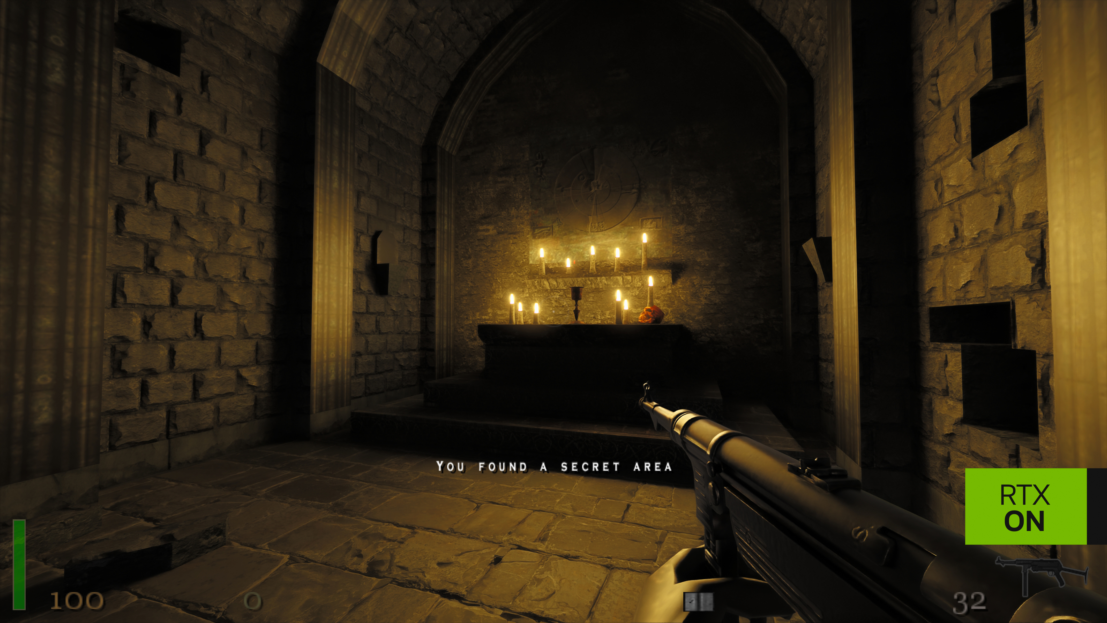 雕像和一些敌人通过 RTX Skin 技术进行次表层散射,当光线穿过它们并传播时它们会发光。RTX 体积渲染技术让空荡荡的教堂充满魔力 - 在激烈的战斗即将展开之前,没有什么比凝视一扇体积光束贯穿的彩色玻璃窗更令人屏息,里面还悬浮着尘埃颗粒。这里的光照经过精心调整,以与原创的基调相匹配,同时为游戏带来全新体验。