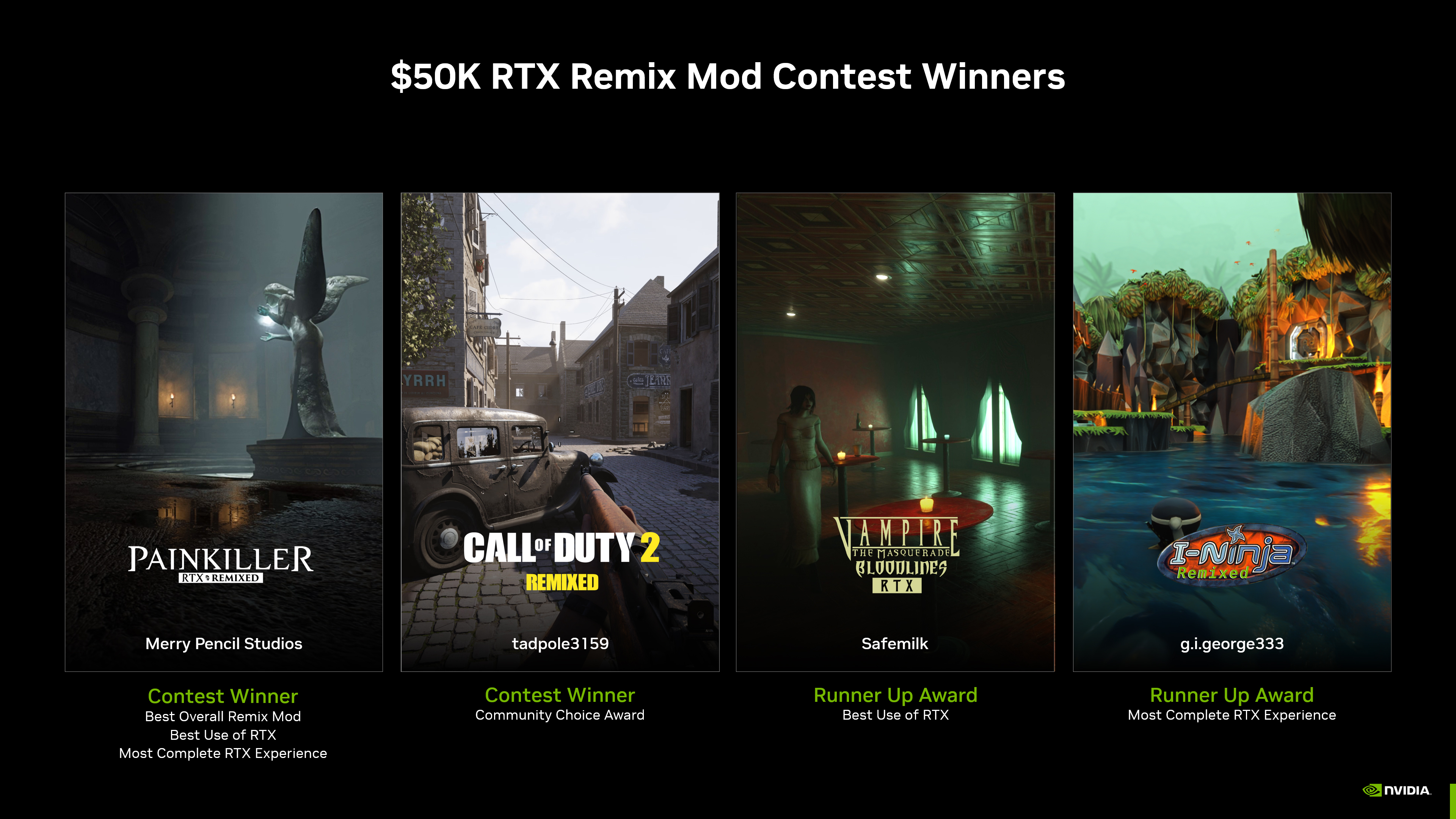 几个月前,我们邀请 modders 参加 NVIDIA 和 ModDB RTX Remix Mod 竞赛。开发新 mods 或更新现有版本的 modders 或团队将获得 5 万美元现金奖励,并分为四类:三类由 ModDB 和 NVIDIA 投票选出,另一类由社区投票选出。