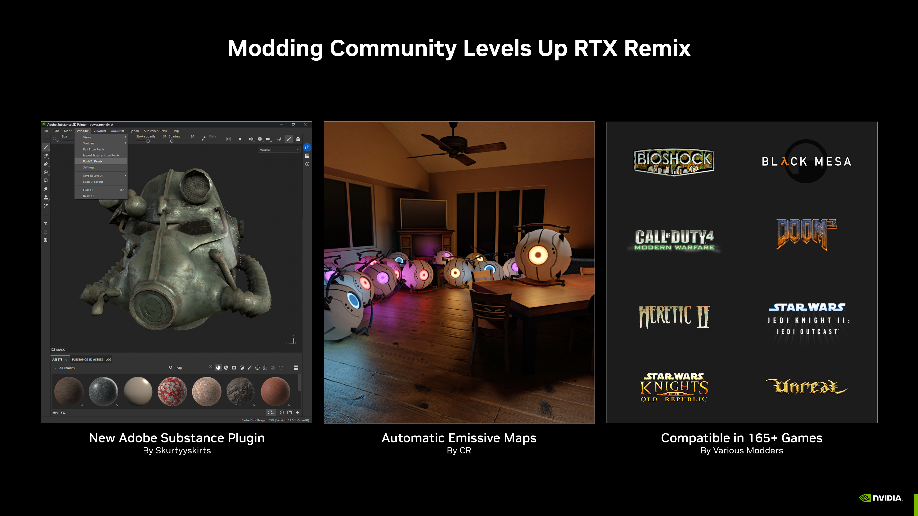 利用 Remix 的开源仓库,RTX Remix 社区成员一直致力于让 Remix Mod 更轻松、更强大。他们最近创建了用于快速导入和导出资产的 Adobe Substance 插件,这是一种自动生成自发光贴图的工具,并将 RTX Remix 游戏的兼容性扩展到超过 165 款游戏。