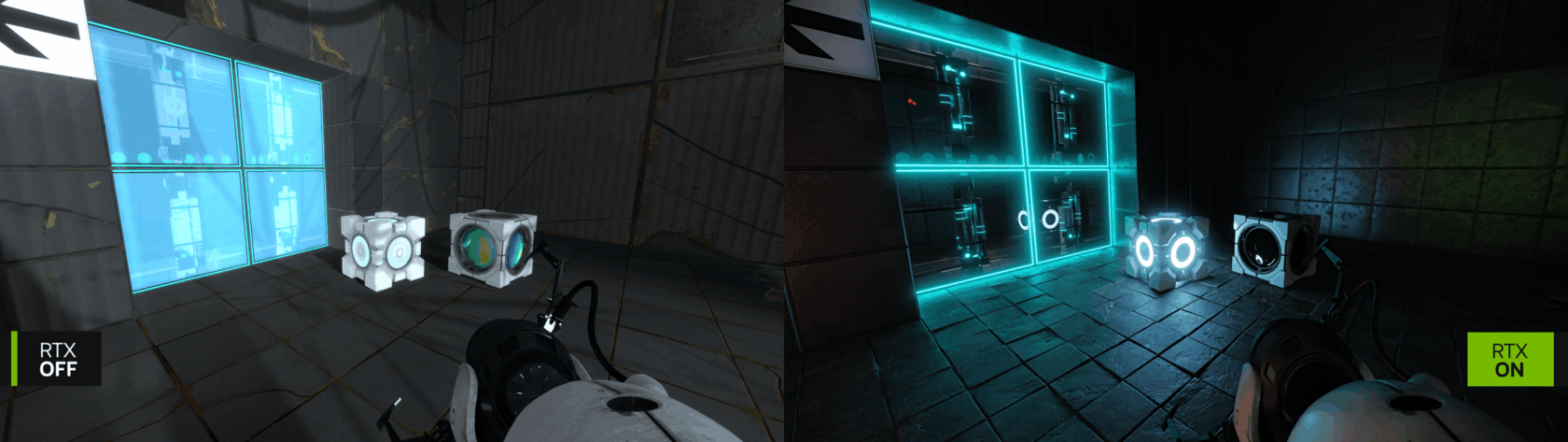 RTX Remix 对“传送门 2 (Portal 2)“中的实验室进行锐化处理:RTX OFF (左) 显示了原始的平面墙和立方体,而 RTX ON (右) 增加了发光面板、反射图块和逼真的阴影,可呈现更宏大的迷宫式环境。在早期,该项目依赖 PBRFusion 等 AI 画质提升工具,但随着时间的推移,相关工作流演变为 AI 与手工艺术的结合。最终结果呈现出更清晰、更宏大的游戏环境,并通过 RTX Remix 的体积渲染和雾气系统进一步增强,让破败的实验室显得更加逼真。