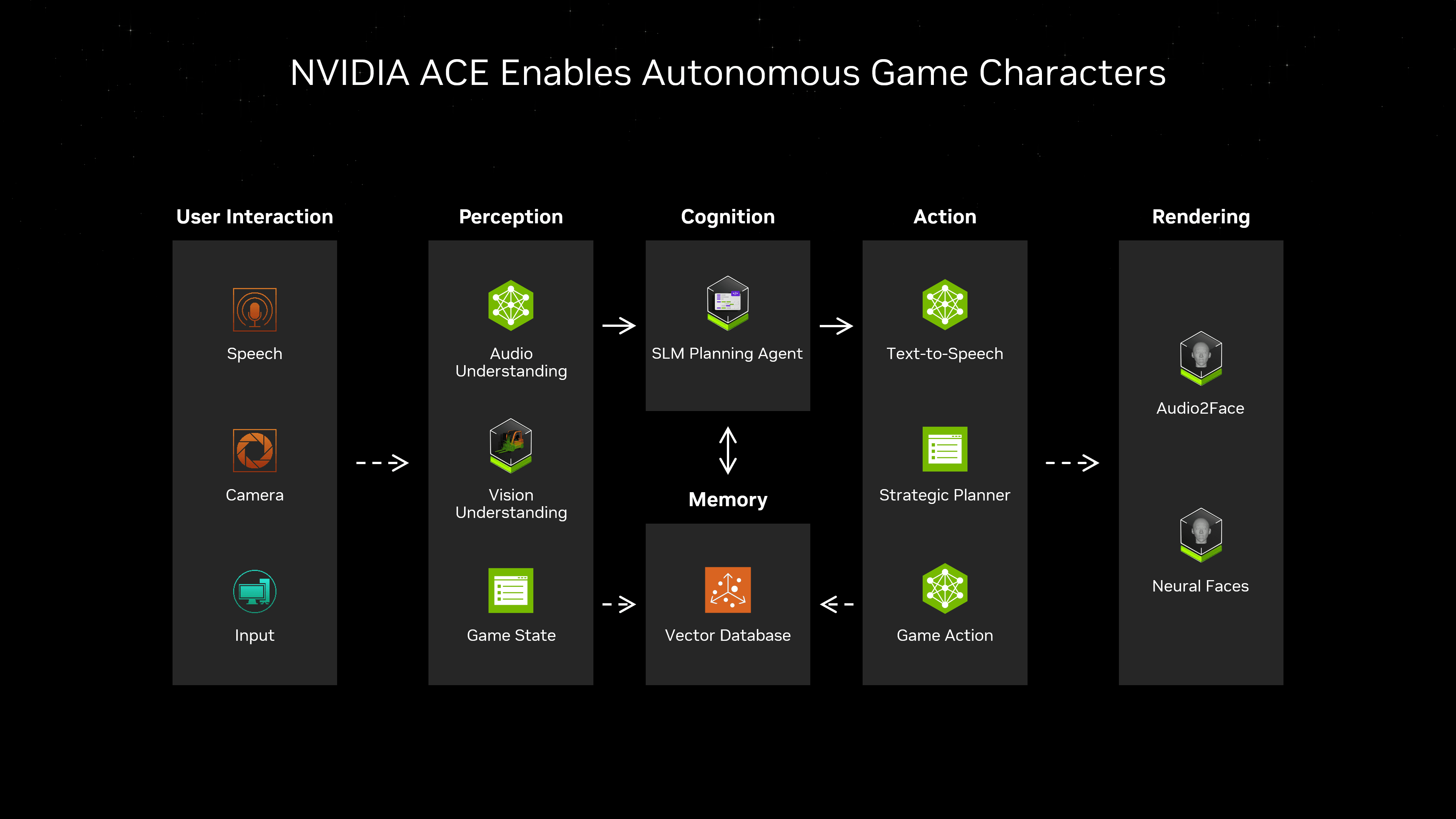 NVIDIA ACE 自主意识游戏角色由一系列生成式 AI 模型提供感知、认知、动作和渲染支持,使开发者能够在游戏中创建像真人玩家一样思考、感觉和行动的 AI 智能体。