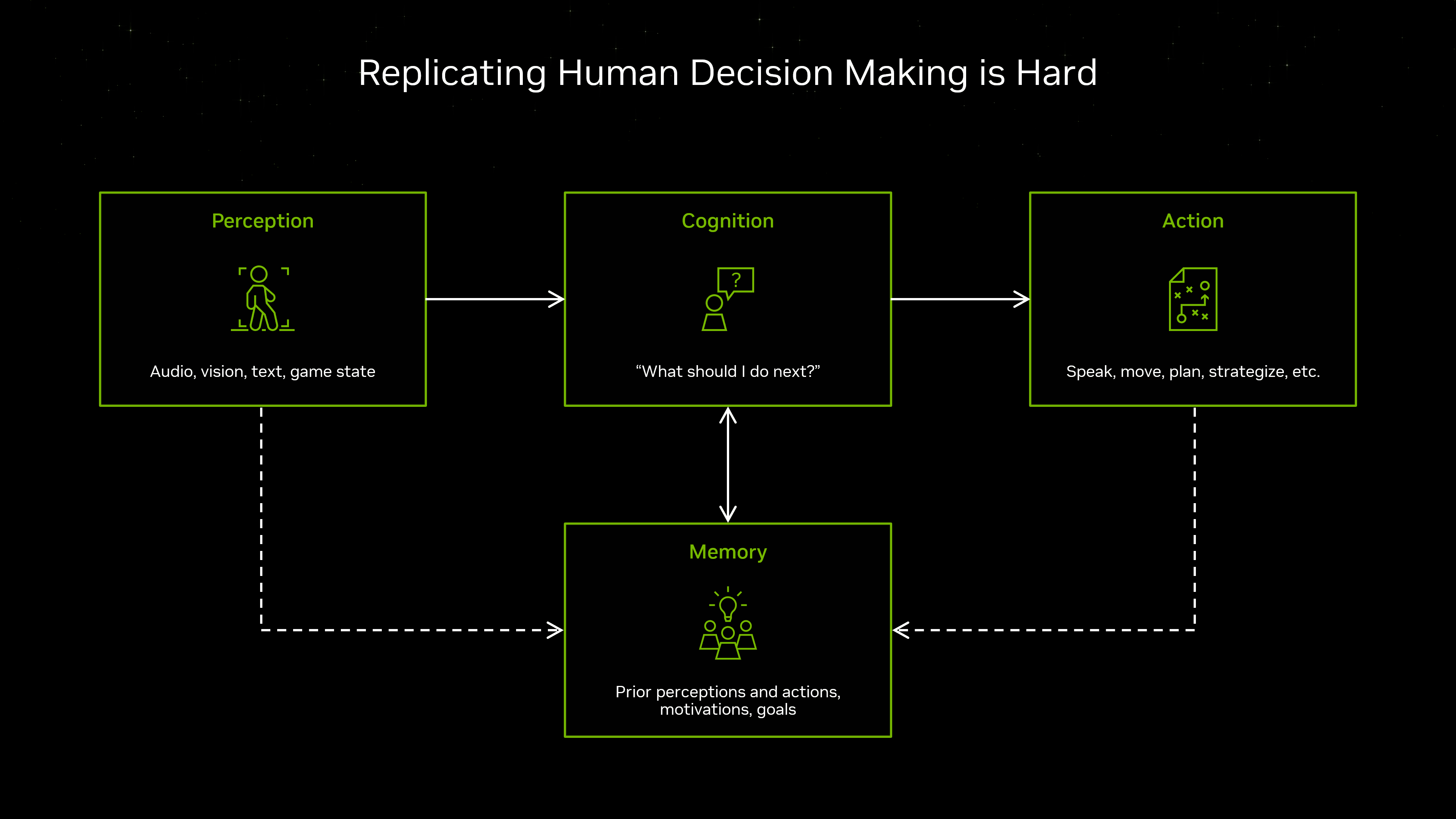 为这些拥有自主意识的游戏角色提供支持的是全新的 ACE 小语言模型 (SLM),它们能够以类似真人玩家的频率进行规划,而这正是做出符合现实的决策所需要的;另外还有用于视觉和音频的多模态语言模型,这些模型能让人工智能角色听到音频提示并感知它们所处的环境。