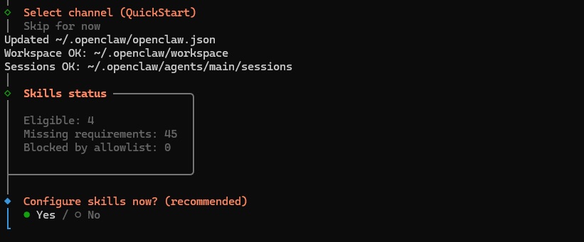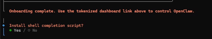 2.11. 最后,在最后一个提示中选择“Yes”(是) 以完成 OpenClaw 安装。