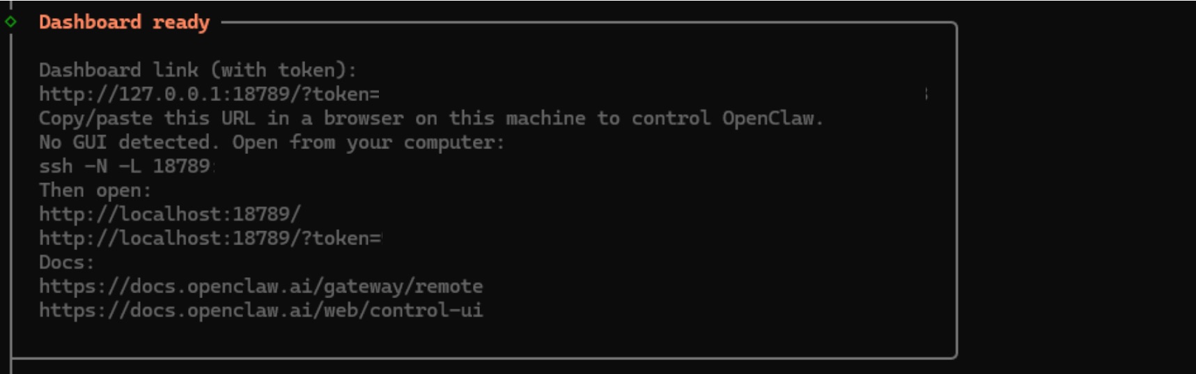 2.10. 生成的终端输出将显示用于访问 OpenClaw 仪表板的 URL。请保存此地址,您将需要它来加载 UI。