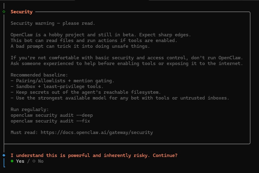 这将在计算机上安装 OpenClaw 以及所有必需的依赖项。在下载一些必要的软件包后,OpenClaw 将提示一条安全警告: