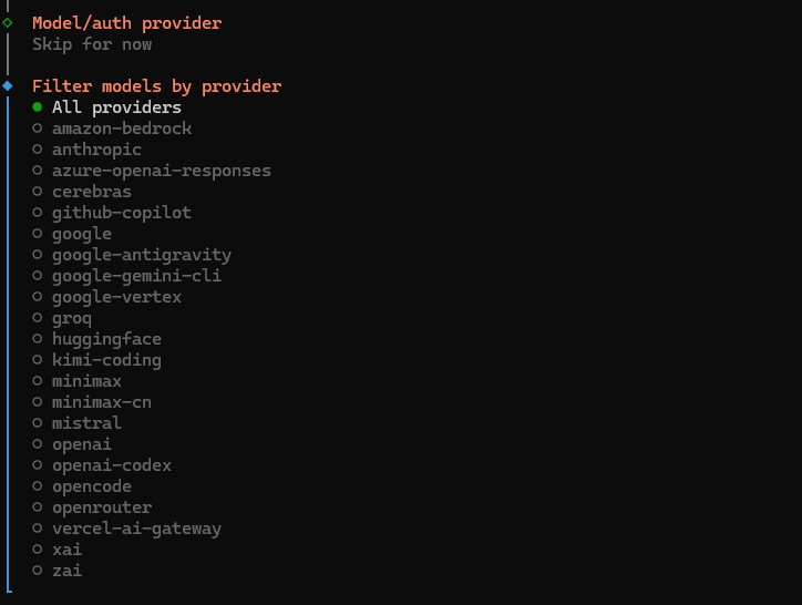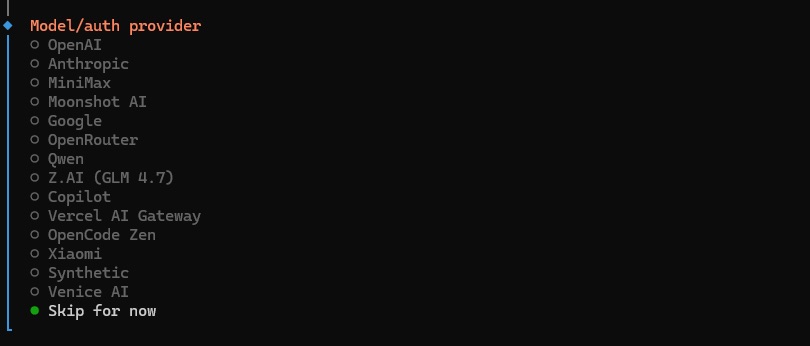 2.4. 将显示用于配置模型提供商的列表。如果希望运行本地模型,请导航到列表最底部,然后选择“Skip for now” (暂时跳过),因为我们稍后会进行配置。如果希望连接云端模型,可以选择一个模型,然后按照指示操作。