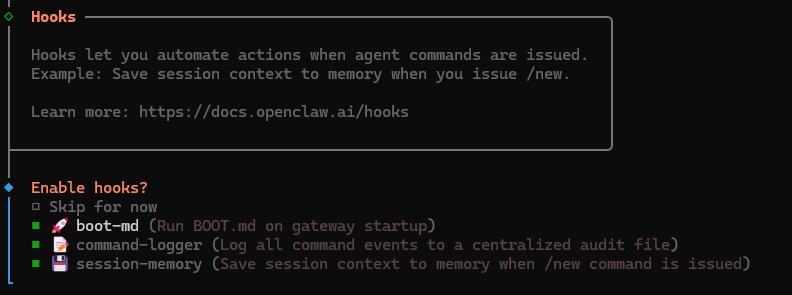 2.9. 下一个提示是安装 Hooks。我们建议选择全部 3 个 Hooks,以获得更好的体验。但请先考虑是否接受数据在本地被记录。