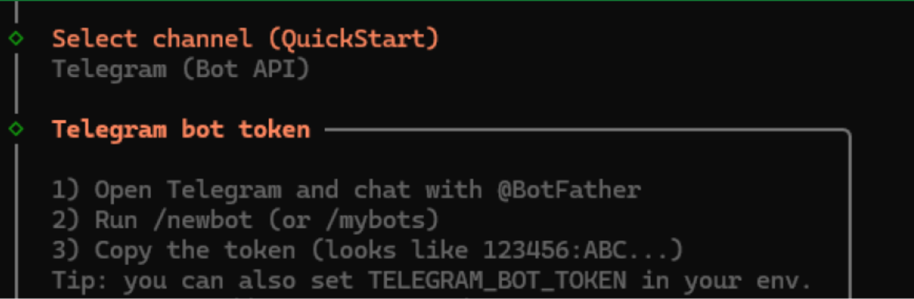 ■ 例如,如果选择 Telegram,则需要创建一个 Telegram 机器人,为 OpenClaw 提供访问 Token,最后再将 Telegram 聊天中的配对代码提供给 OpenClaw。