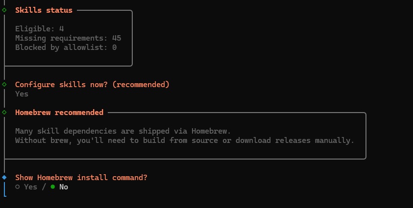 2.8. 下一步,OpenClaw 将提示安装 homebrew 软件包 - 选择“No” (否),Mac 安装需要此软件包,但 Windows 不需要。