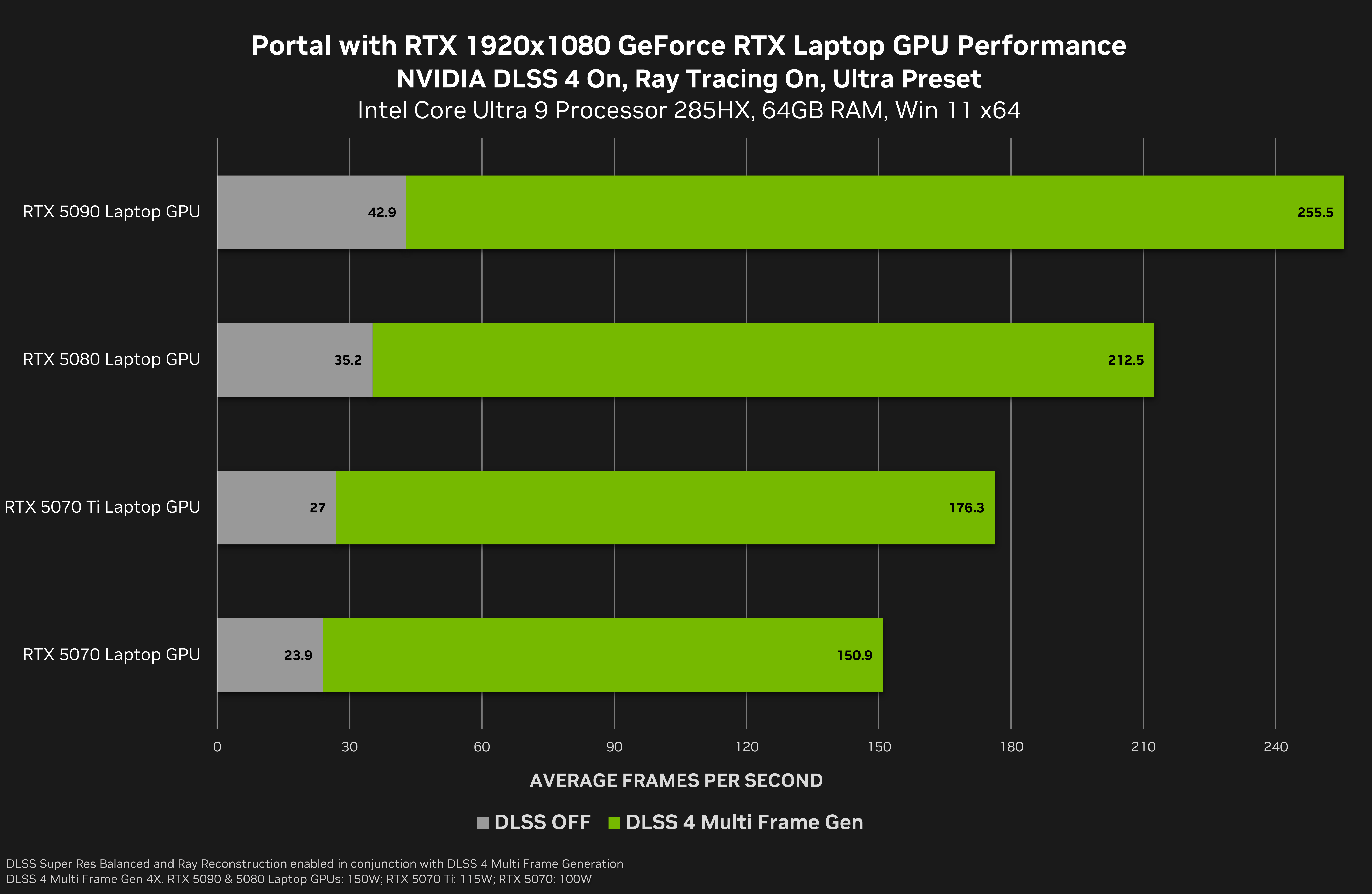 借助 DLSS 4 多帧生成,笔记本电脑玩家还可以在“传送门 (Portal)” RTX 版中以最高细节水平畅玩这款游戏,在 1920x1080 分辨率下,帧率可平均提升至原来的 6.2 倍,从而实现高达 250 FPS 的移动游戏体验: