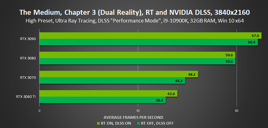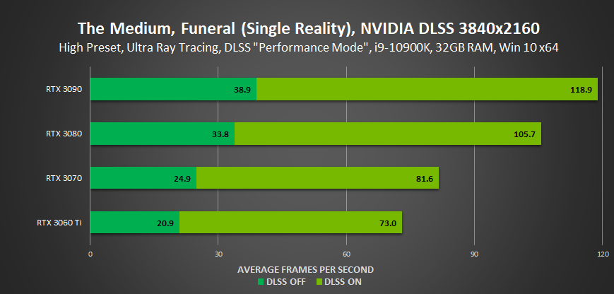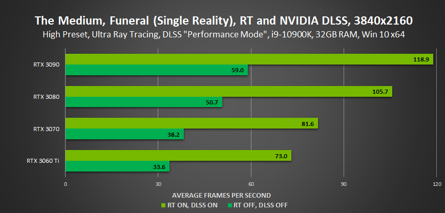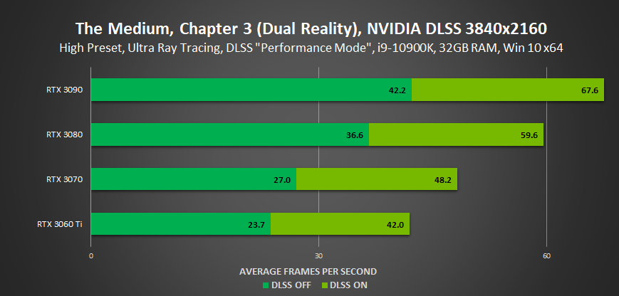游戏同时在两个不同的现实中发生,灵媒相当于同时渲染两款游戏,对 GPU 的需求大大提高。为提供帮助,我们与 Bloober Team 合作,将广受好评的 AI 加速技术 NVIDIA DLSS 应用于灵媒,性能提升高达 100%。